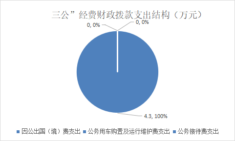 2022年“三公”经费财政拨款支出决算中,因公出国(境)费支出决算0万元,占0%;公务用车购置及运行维护费支出决算0万元,占0%;公务接待费支出决算4.30万元,占100%。具体情况如下:
