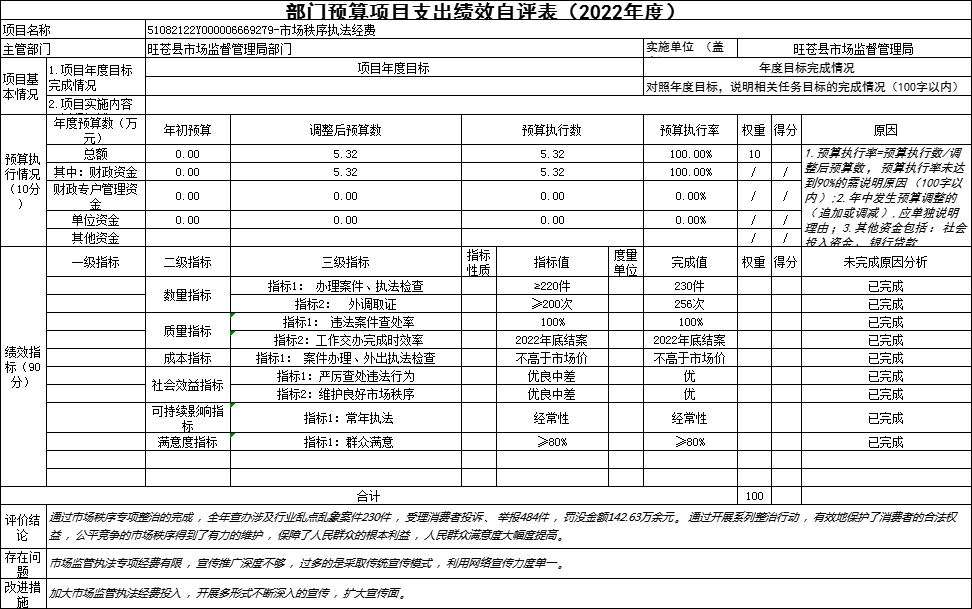 2022年,通过市场监管领域的不断努力,服务对象满意度和人民群众满意度不断提高,较好地完成了省局下达我局专项资金绩效评价的各项指标及年初确定的目标任务。