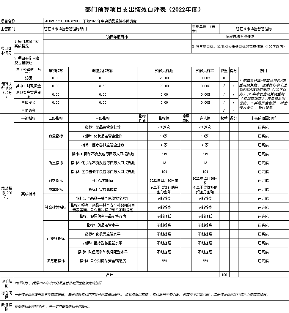 2022年,上级下达我局中央药品监管补助资金20万元,其中年初提前下达11.5万元,年中追加8.5万元,旺苍县财政局均已全额拨付我局。资金申报、资金使用均符合专项经费使用管理办法相关规定,在使用过程中严格开支范围、标准及支付进度、支付依据合规合法,资金支付与预算相符,绩效目标设定明确,资金使用不涉及预算调整。