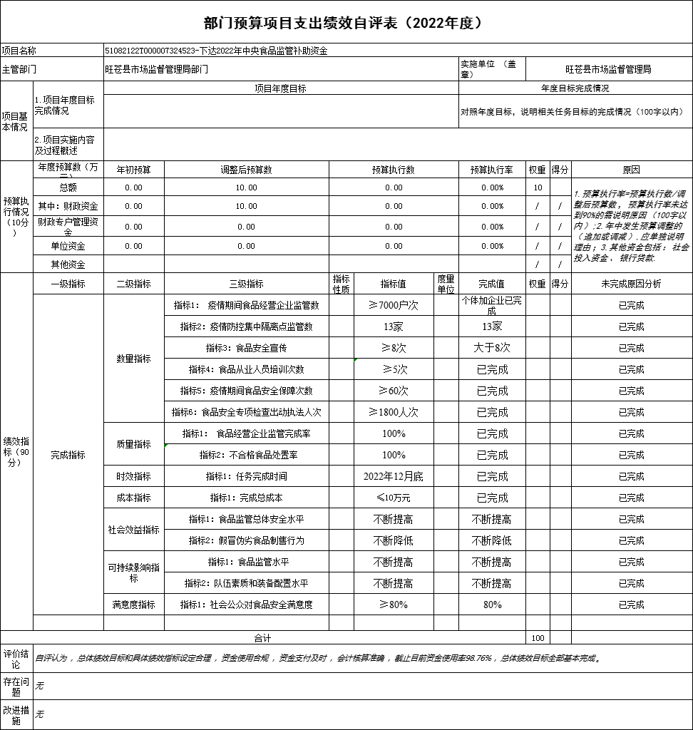 2022年,通过中央食品监管补助资金情防控集中供餐食品安全监管经费的实施,自评认为,总体绩效目标和具体绩效指标设定合理,资金使用合规,资金支付及时,会计核算准确,截至目前资金使用率98.76%,总体绩效目标全部基本完成。