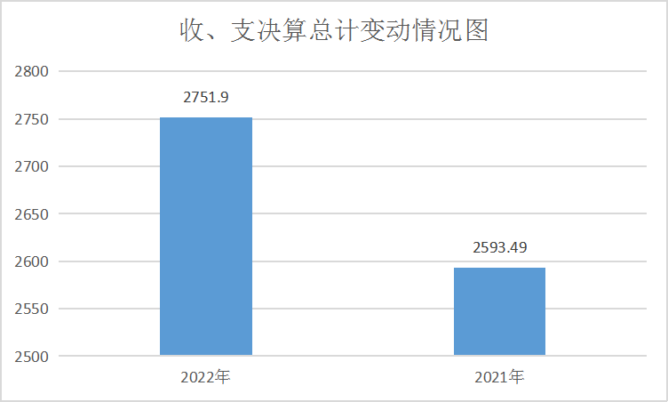 2022年度收、支总计2751.90万元。与2021年相比,收、支总计各增加158.41万元,增长6.11%。主要变动原因是人员基础绩效增加。