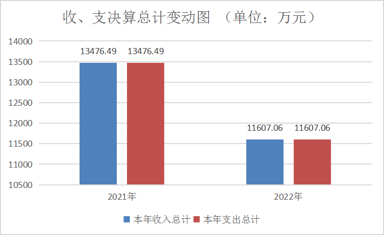 2022年度收、支总计11607.06万元。与2021年相比,收、支总计各减少1869.43万元,下降13.87%。主要变动原因一是2022年无结转结余金额;二是2022年无三支一扶人员经费支出;三是2022年无网络租赁费预算。