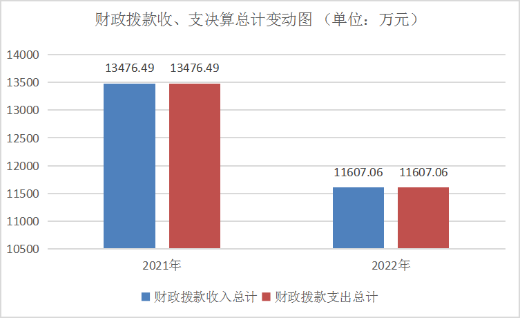 2022年财政拨款收、支总计11607.06万元。与2021年相比,财政拨款收、支总计各减少1869.43万元,下降13.87%。主要变动原因一是2022年无结转结余金额;二是2022年无三支一扶人员经费支出;三是2022年无网络租赁费预算。