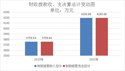 2022年财政拨款收、支总计3759.64万元。与2021年相比,财政拨款收、支总计减少434.02万元,下降10.35%。主要变动原因一是调走2名参公干部、退休两名参公干部,公用经费就相应的减少,二是无上年结转结余资金。