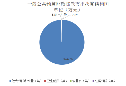 2022年一般公共预算财政拨款支出3,759.64万元,主要用于以下方面:社会保障和就业支出3,742.97万元,占99.56%;卫生健康支出4.30万元,占0.11%;农林水支出5.35万元,占0.14%;住房保障支出7.02万元,占0.19%。