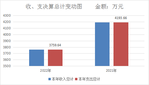 2022年度收、支总计3759.64万元。与2021年相比,收、支总计各减少434.02万元,下降10.35%。主要变动原因一是调走2名参公干部、退休2名参公干部,公用经费就相应的减少;二是无上年结转结余资金。