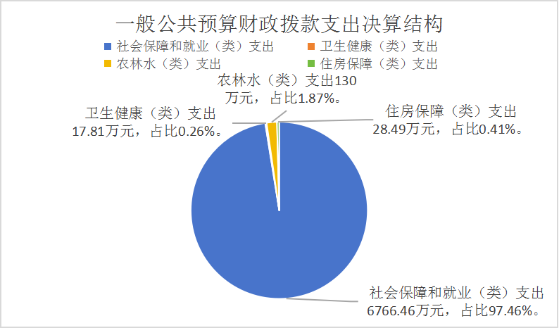2022年一般公共预算财政拨款支出6942.76万元,主要用于以下方面:社会保障和就业(类)支出6766.46万元,占97.46%;卫生健康(类)支出17.81万元,占0.26%;农林水(类)支出130.00万元,占1.87%;住房保障(类)支出28.49万元,占0.41%。