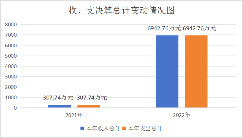 2022年度收、支总计6942.76万元。与2021年相比,收、支总计各增加6635.02万元,增长2156.05%。主要变动原因是2022年旺苍县社会保险事业管理局、旺苍县机关事业单位社会保险局、旺苍县城乡居民社会养老保险局合并成立旺苍县社会保险事务中心,人员经费、公用经费及项目经费全年预算均增加。