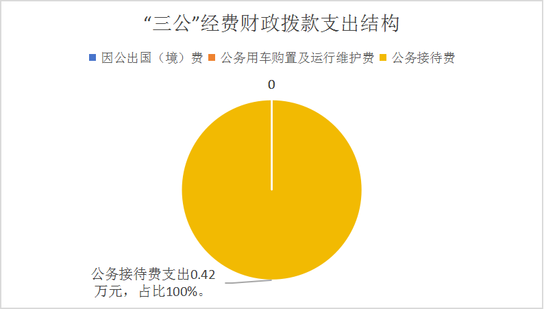 2022年“三公”经费财政拨款支出决算中,因公出国(境)费支出决算0万元,占0%;公务用车购置及运行维护费支出决算0万元,占0%;公务接待费支出决算0.42万元,占100%。具体情况如下: