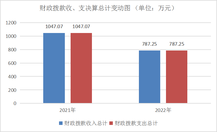 2022年财政拨款收、支总计787.25万元。与2021年相比,财政拨款收、支总计各减少259.82万元,下降24.81%。主要变动原因一是2022年无结转结余金额;二是2022年无三支一扶人员经费支出;三是2022年无网络租赁费预算。
