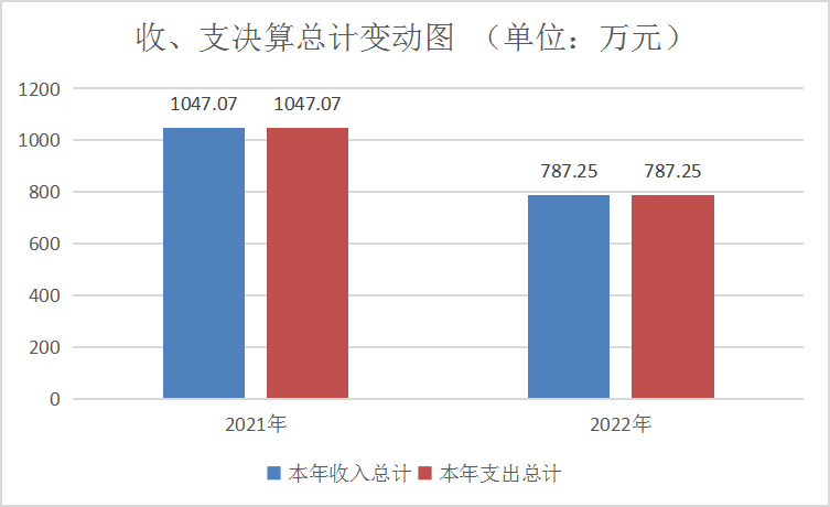 2022年度收、支总计787.25万元。与2021年相比,收、支总计各减少259.82万元,下降24.81%。主要变动原因一是2022年无结转结余金额;二是2022年无三支一扶人员经费支出;三是2022年无网络租赁费预算。