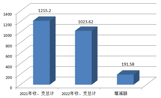 2022年度收入总计1023.62万元。与2021年相比,收入减少191.58万元,下降15.77%。主要变动原因是2022年专项资金较2021年减少;2022年度支出总计1023.62万元。与2021年相比,支出减少191.58万元,下降15.77%。主要变动原因是2022年专项资金较2021年减少