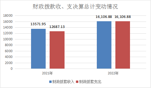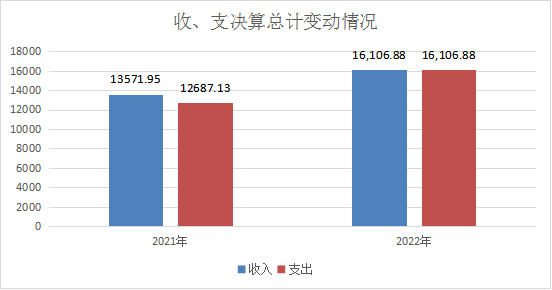 2022年度收入、支出总计均为16,106.88万元。与2021年相比,财政拨款收入总计增加2534.93万元、增加18.68%,主要变动原因是困难群众救助标准增加及新增建设项目;支出总计增加3419.75万元,增加26.95%,主要变动原因是困难群众救助标准增加及新增建设项目,全年收入支出与预算持平。