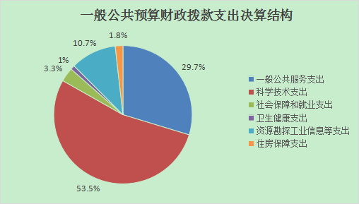 2022年一般公共预算财政拨款支出2027.44万元,主要用于以下方面:一般公共服务支出602.39万元,占29.7%;科学技术支出1084.75万元,占53.5%;社会保障和就业支出66.30万元,占3.3%;卫生健康支出21.39万元,占1%;资源勘探工业信息等支出216.94万元,占10.7%;住房保障支出35.67万元,占1.8%。