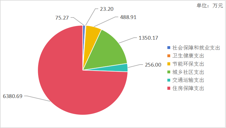 2022年一般公共预算财政拨款支出8,574.24万元,主要用于以下方面: 社会保障和就业支出75.27万元,占0.9%;卫生健康支出23.2万元,占0.3%;节能环保支出488.91万元,占5.7%;城乡社区支出1,350.17万元,占15.7%;交通运输支出256万元,占3%;住房保障支出6,380.69万元,占74.4%。