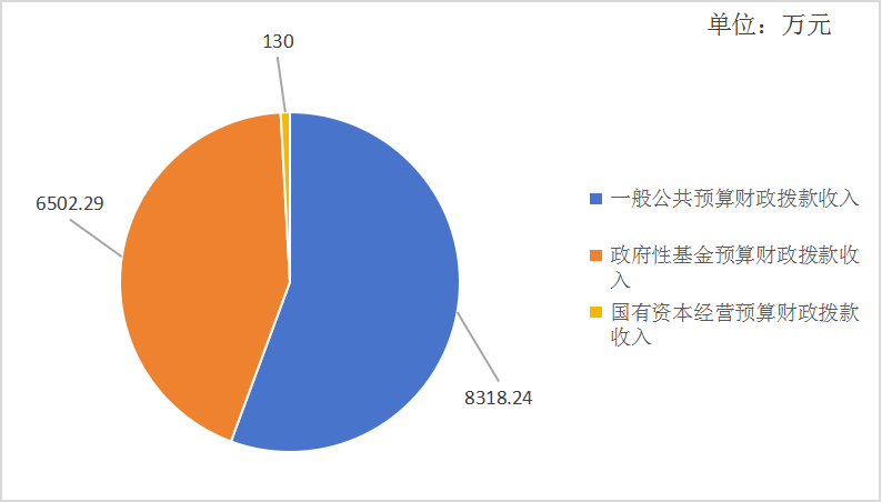 2022年本年收入合计14,950.53万元,其中:一般公共预算财政拨款收入8,318.24万元,占55.6%;政府性基金预算财政拨款收入6,502.29万元,占43.5%;国有资本经营预算财政拨款收入130万元,占0.9%。