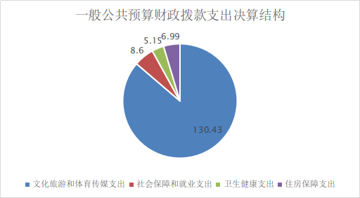 2022年一般公共预算财政拨款支出151.17万元,主要用于以下方面:文化旅游体育与传媒(类)支出130.43万元,占86.28%;社会保障和就业(类)支出8.60万元,占5.69%;卫生健康支出5.15万元,占3.41%;住房保障支出6.99万元,占4.62%。
