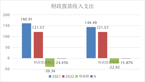 2022年财政拨款收、支总计121.57万元。与2021年相比,财政拨款收入减少39.34万元,下降24.45%%,主要变动原因是人员减少。与2021年相比,财政拨款支出减少22.92万元,减少15.87%,主要变动原因是人员减少。