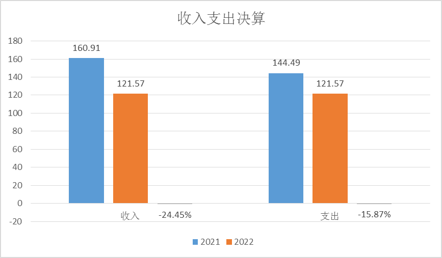 2022年度收、支总计121.57万元,与2021年相比,收入减少39.34万元,减少24.45%,主要变动原因是人员减少。与2021年相比,支出减少22.92万元,减少15.87%,主要变动原因是人员减少。