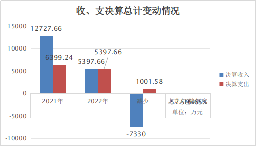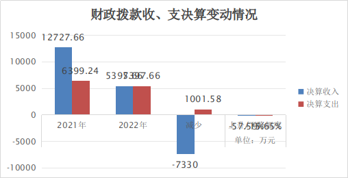 2022年财政拨款收、支总计5397.66万元。与2021年相比,财政拨款收入减少7330万元,下降57.59%;支出总计增加998.42万元,增长22.70%。主要变动原因一是上级对保障性住房资金(公共租赁住房、老旧小区改造、棚户区改造)投入大幅减少,二是单位3人退休,基本支出减少,三是依据财政决算要求编制决算报告。