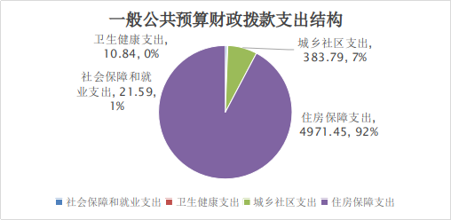 2022年一般公共预算财政拨款支出5387.66万元,主要用于以下方面:社会保障和就业支出21.59万元,占0.40%;卫生健康支出10.84万元,占0.20%;城乡社区支出383.79万元占7.12%;住房保障支出4971.44万元,占92.28%。