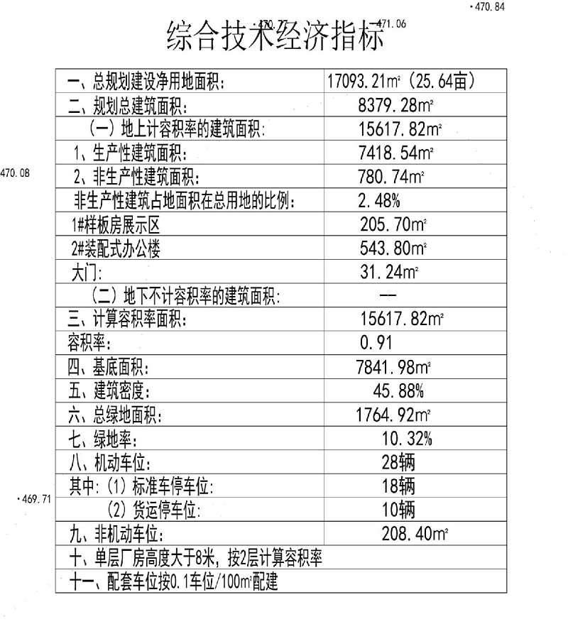 拟建方案综合总经济技术指标为:总规划建设净用地面积17093.21㎡(25.64亩);规划总建筑面积8702.14㎡;地上计容积率的建筑面积15617.82㎡,其中,生产性建筑面积7418.54㎡(单层厂房高度大于8米,按2层计算容积率),非生产性建筑面积780.74㎡(1#样板房展示区205.70㎡,2#装配式办公楼543.80㎡,大门31.24㎡),非生产性建筑占地面积在总用地的比例2.48%;容积率0.91;基底面积7841.98㎡,建筑密度45.88%;总绿地面积1764.92㎡,绿地率10.32%;机动车位28辆,其中,标准车停车位18辆,货运停车位10辆;非机动车位208.40㎡。(详图见后)
