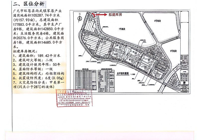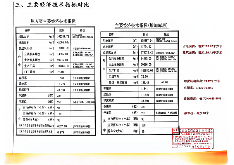 拟建方案综合总经济技术指标为:总用地面积105287.74㎡;占地面积41754.42㎡;总建筑面积178072.42㎡,其中,公共服务用房14685.00㎡,生活服务用房20276.00㎡,生产厂房142850.00㎡,门卫管理72.00㎡,油漆、危废库房189.42㎡;容积率1.841;绿地率11.42%;建筑密度43.90%;倒班房400套;停车位253辆,其中,室内停车位(小车)90辆,室外停车位(小车)128辆,中停车位(大车)35辆。