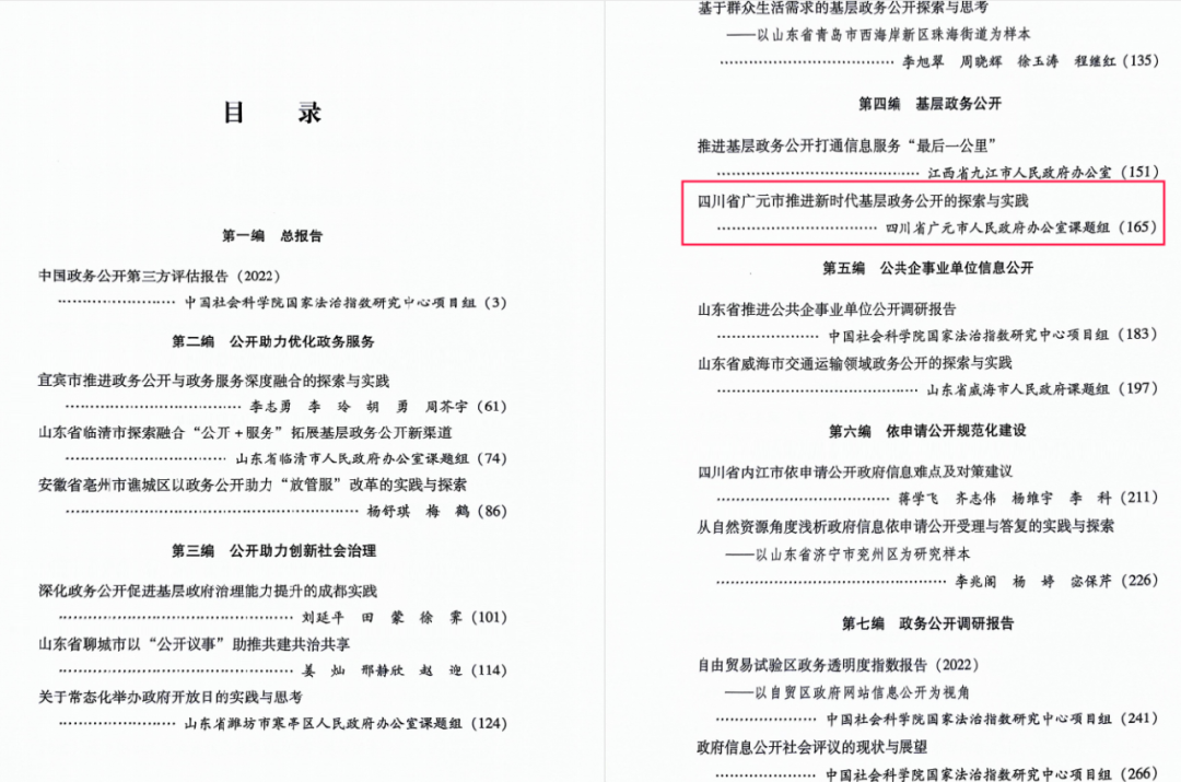 3月1日,记者从广元市政府办公室获悉,由该办编撰推送的《四川省广元市推进新时代基层政务公开的探索与实践》被编入《中国政务公开发展报告(2023)》(中国社会科学出版社主编)基层政务公开优秀案例,此为广元政务公开实践探索方面的经验首次被收录进国家级出版物。