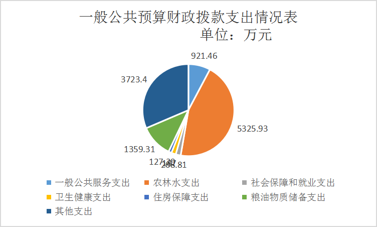 2023年度一般公共预算财政拨款支出11853.20万元,主要用于以下方面:一般公共服务支出921.46万元,占7.77%;农林水支出5325.93万元,占44.93%;社会保障和就业支出208.81万元,占1.76%;卫生健康支出187万元,占1.58%;住房保障支出127.29万元,占1.07%;粮油物资储备支出1359.31万元,占11.47%;其他支出3723.40万元,占31.45%。