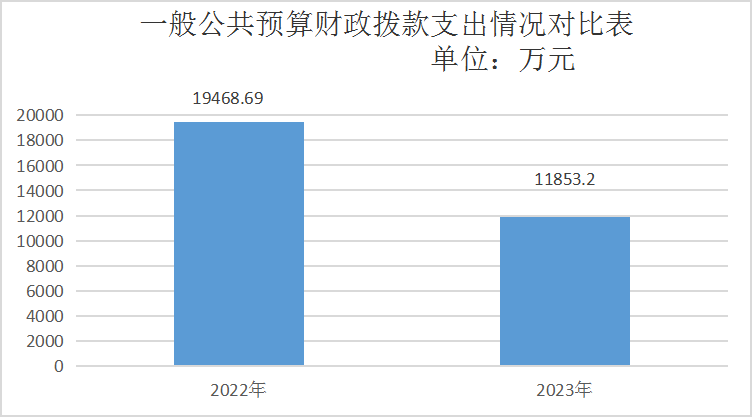 2023年度一般公共预算财政拨款支出11853.20万元,占本年支出合计的100%。与2022年度相比,一般公共预算财政拨款支出减少7615.49万元,下降39.12%%。主要变动原因是人员退休调出及项目收入支出减少。
