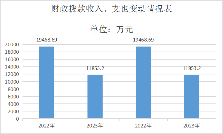 2023年度财政拨款收、支总计均为11853.20万元。与2022年度相比,财政拨款收、支总计各减少7615.49万元,下降39.12%。主要变动原因是主要变动原因是人员退休调出及项目收入支出减少。