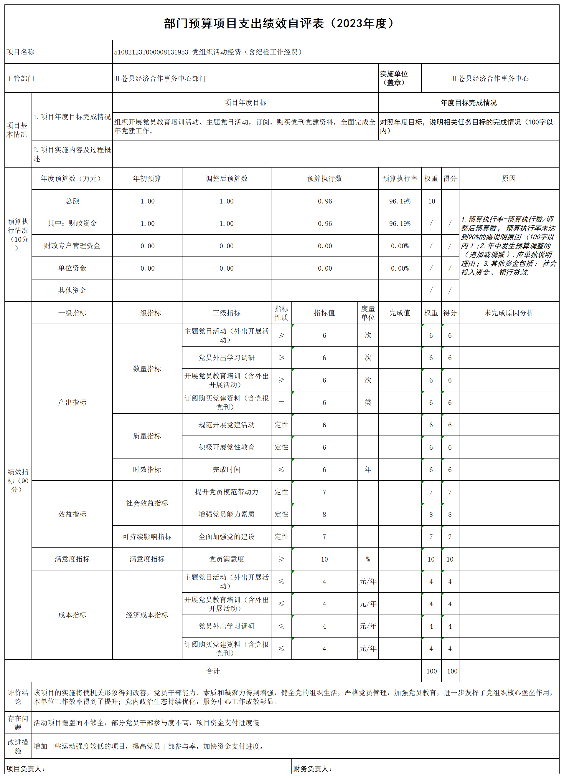 组织对2023年度一般公共预算、政府性基金预算、国有资本经营预算、社会保险基金预算以及资本资产、债券资金等全面开展绩效自评,形成县经济合作事务中心部门整体(含部门预算项目)绩效自评报告、招商引资专项预算项目绩效自评报告,其中,县经济合作事务中心部门整体(含部门预算项目)绩效自评得分为94分,绩效自评综述:2023 年我单位整体支出绩效自查自评结果良好,全年基本支出保证了部门的正常运转,项目支出保障了重点工作的开展。“招商引资专项经费”专项预算项目绩效自评得分为91分,绩效自评综述:2023年我单位项目支出绩效自查自评结果良好,全年项目支出保障了重点工作的开展。绩效自评报告详见附件。“党组织活动经费”专项预算项目绩效自评得分为92.6分,绩效自评综述:2023年我单位项目支出绩效自查自评结果良好,全年项目支出保障了重点工作的开展。绩效自评报告详见附件。