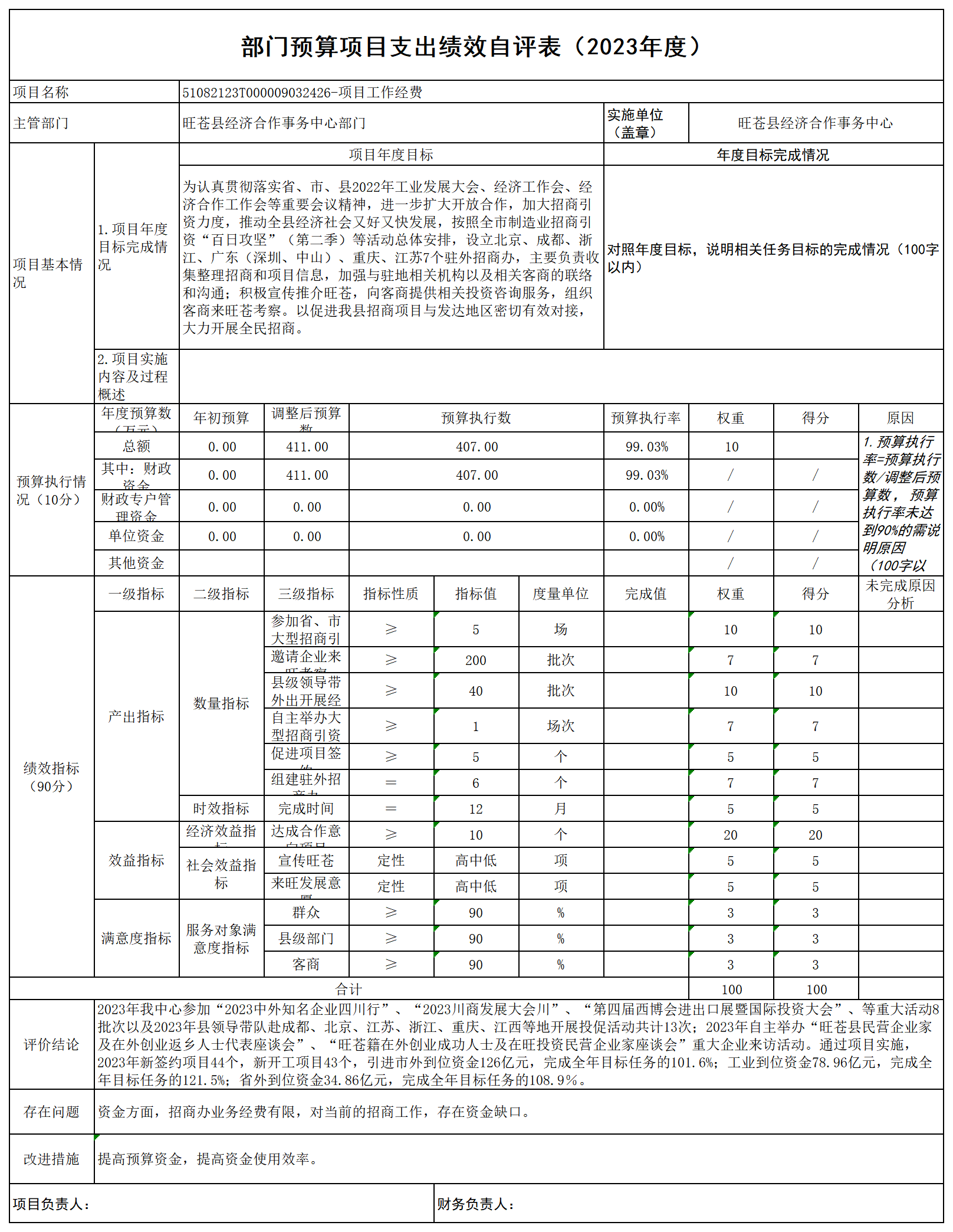 (2)项目调整(满分4分,得分4分):我单位对已完成项目,结转指标年末退回财政;对需调整的项目,执行过程中采取相对应的调整措施,得4分。我单位严格按照财务管理制度,提高资金使用效益,资金主要用于办公耗材、委托招商、招商引资宣传材料印制、外出招商引资开支的差旅费、接待客商等招商引资工作所需的费用。2023年,招商引资专项经费财政预算400万元,实际支出资金400万元,资金使用率100%。