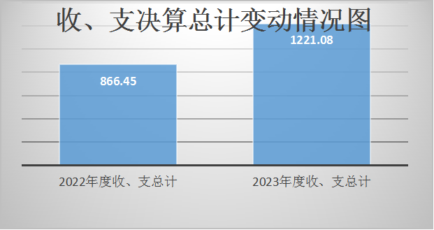 2023年度收、支总计均为1221.08万元。与2022年度相比,收、支总计各增加354.63万元,增长29.04%。主要变动原因是聘用人员工资、物业费、后勤保障等纳入预算。