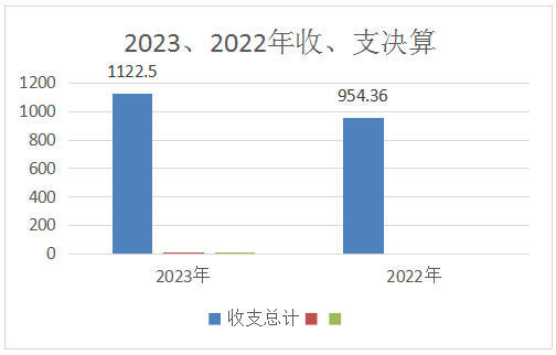 2023年度收、支总计均为1122.5万元。(其中:2023年收入总计含年度执行中追加267.5万元)与2022年相比,收、支总计各增加168.14万元,增长18%。主要变动原因是人员变动、调资、抚恤金等基本费用支出增加。