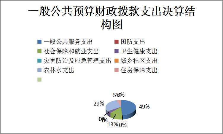 2023年度一般公共预算财政拨款支出2002.23万元,主要用于以下方面:一般公共服务支出974.56万元,占48.7%;国防支出1.65万元,占0.1%;社会保障和就业支出255.04万元,占12.7%;卫生健康支出78.60万元,占3.9%;住房保障支出97.10万元,占4.8%;农林水支出588.23万元,占29.4%;城乡社区支出2.05万元,占0.1%;灾害防治及应急管理支出5万元,占0.3%。