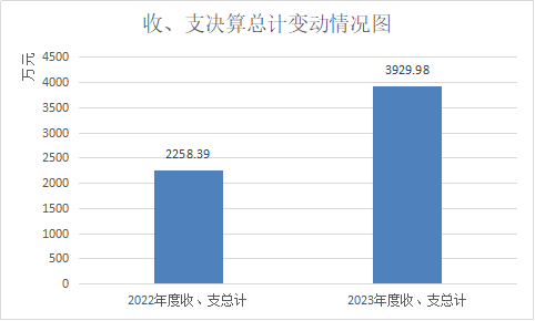 2023年度收、支总计均为3929.98万元。与2022年度相比,收、支总计各增加1671.59万元,增长74%。主要变动原因是离退休干部慰问金纳入预算及解决历史遗留问题项目资金增加。