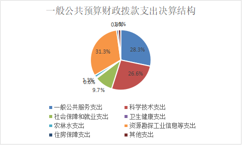 2023年度一般公共预算财政拨款支出3929.98万元,主要用于以下方面:一般公共服务支出1113.78万元,占28.3%;科学技术支出1042.84万元,占26.6%;社会保障和就业支出381.94万元,占9.7%;卫生健康支出24.86万元,占0.6%;农林水支出52万元,占1.3%;资源勘探工业信息等支出1228.09万元,占31.3%;住房保障支出36.47万元,占0.9%;其他支出50万元,占1.3%。
