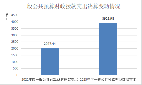 2023年度一般公共预算财政拨款支出3929.98万元,占本年支出合计的100%。与2022年度相比,一般公共预算财政拨款支出增加1902.54万元,增长93.8%。主要变动原因是离退休干部慰问金纳入预算及解决历史遗留问题项目资金支出增加。