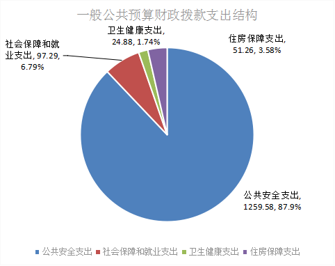 2023年度一般公共预算财政拨款支出1432.99万元,主要用于以下方面:公共安全支出1259.58万元,占87.9%;社会保障和就业支出97.29万元,占6.79%;卫生健康支出24.88万元,占1.74%;住房保障支出51.26万元,占3.58%;。