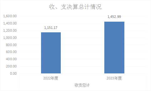 2023年度收、支总计均为1452.99万元。与2022年度相比,收、支总计各增加301.82万元,增长26.22%。主要变动原因是一是本年年初新增10人;二是警务辅助人员经费纳入部门决算;三是基础绩效奖和退休人员慰问金纳入部门决算。