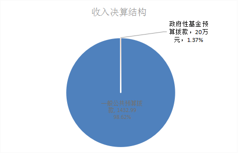 2023年度本年收入合计1452.99万元,其中:一般公共预算财政拨款收入1432.99万元,占98.62%;政府性基金预算财政拨款收入20万元,占1.37%;国有资本经营预算财政拨款收入0万元,占0%;上级补助收入0万元,占0%;事业收入0万元,占0%;经营收入0万元,占0%;附属单位上缴收入0万元,占0%;其他收入0万元,占0%。