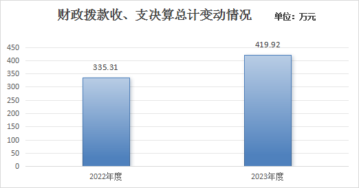 2023年财政拨款收、支总计419.92万元。与2022年相比,财政拨款收、支总计各增加84.61万元,增长25.23%。主要变动原因是人员经费、公业务费用增加;信息化建设要求,增加相关费用支出;“市带县”巡察等增加巡察工作经费。