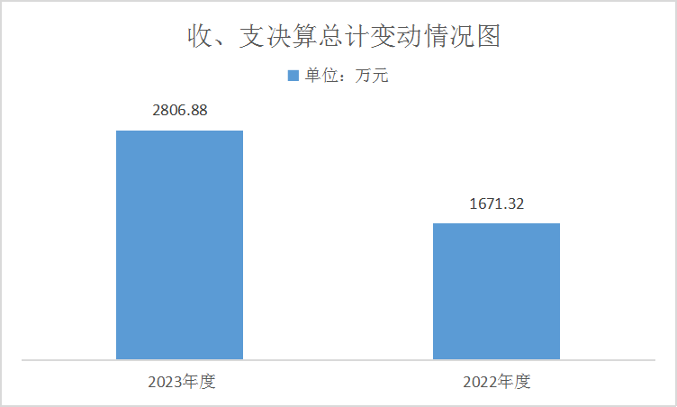 2023年度财政拨款收、支总计均为2806.88万元。与2022年度相比,财政拨款收、支总计各增加1135.56万元,增长68%。主要变动原因是2023年初预算较上年新增人员5人,人员清算增加;2022年部分绩效、工资在23年支出。2022年第一批省级城乡建设发展专项资金(城乡垃圾处理设施建设)预算1758万元在本年支出691.5万元,2021年第二批省级城乡建设发展专项资金685万元在本年支出119.6万元。凤凰梁临时市场搭建的运行经费20万元和省级卫生县城创建复审工作经费30万均在本年支出。