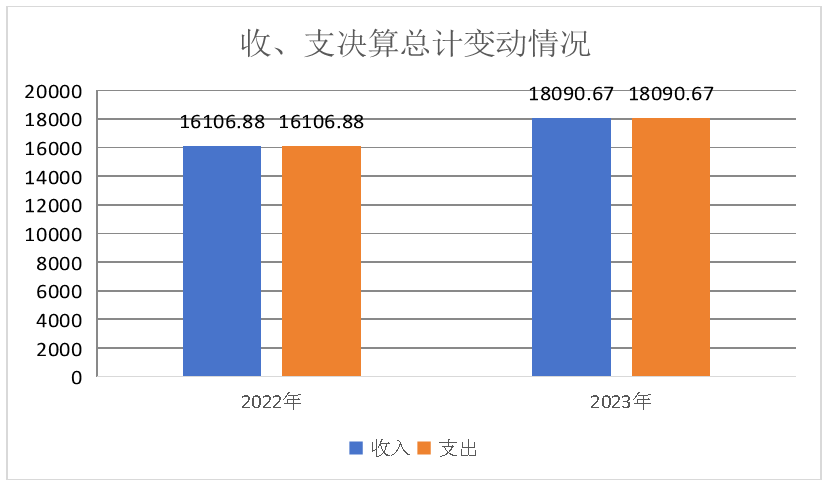 2023年度收、支总计均为18090.67万元。与2022年度相比,收、支总计各增加1983.79万元,增长12.32%。主要变动原因是困难群众救助标准增加及新增建设项目。