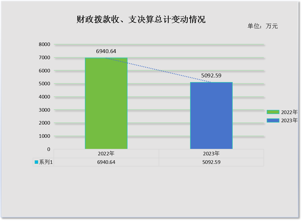 2023年度财政拨款收、支总计均为5092.59万元。与2022年度相比,财政拨款收、支总计各减少1848.05万元,下降26.6%。主要变动原因是专项资金减少。