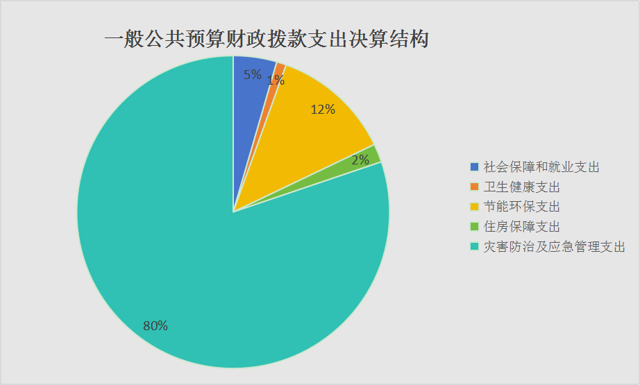 2023年度一般公共预算财政拨款支出5092.59万元,主要用于以下方面:社会保障和就业支出227.51万元,占4.5%;卫生健康支出53.3万元,占1%;节能环保支出630.96万元,占 12.4 %;住房保障支出96.28万元,占1.9%;灾害防治及应急管理支出4084.54万元;占80.2%。