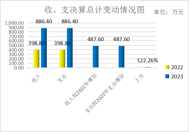 2023年度收、支总计886.40万元。与2022年相比,收、支总计各增加487.60万元,增加122.26%。主要变动原因是项目增加。