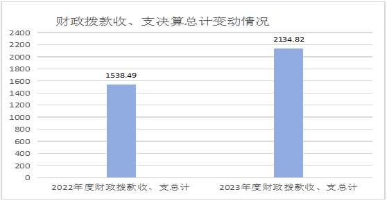2023年度财政拨款收、支总计均为2134.82万元。与2022年度相比,财政拨款收、支总计各增加596.33万元,增长38.76%。主要变动原因是干部职工人数增加、项目预算增加。