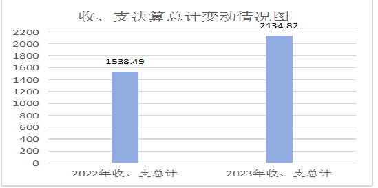 2023年度收、支总计均为2134.82万元。与2022年度相比,收、支总计各增加596.33万元,增长38.76%。主要变动原因是干部职工人数增加、项目预算增加。